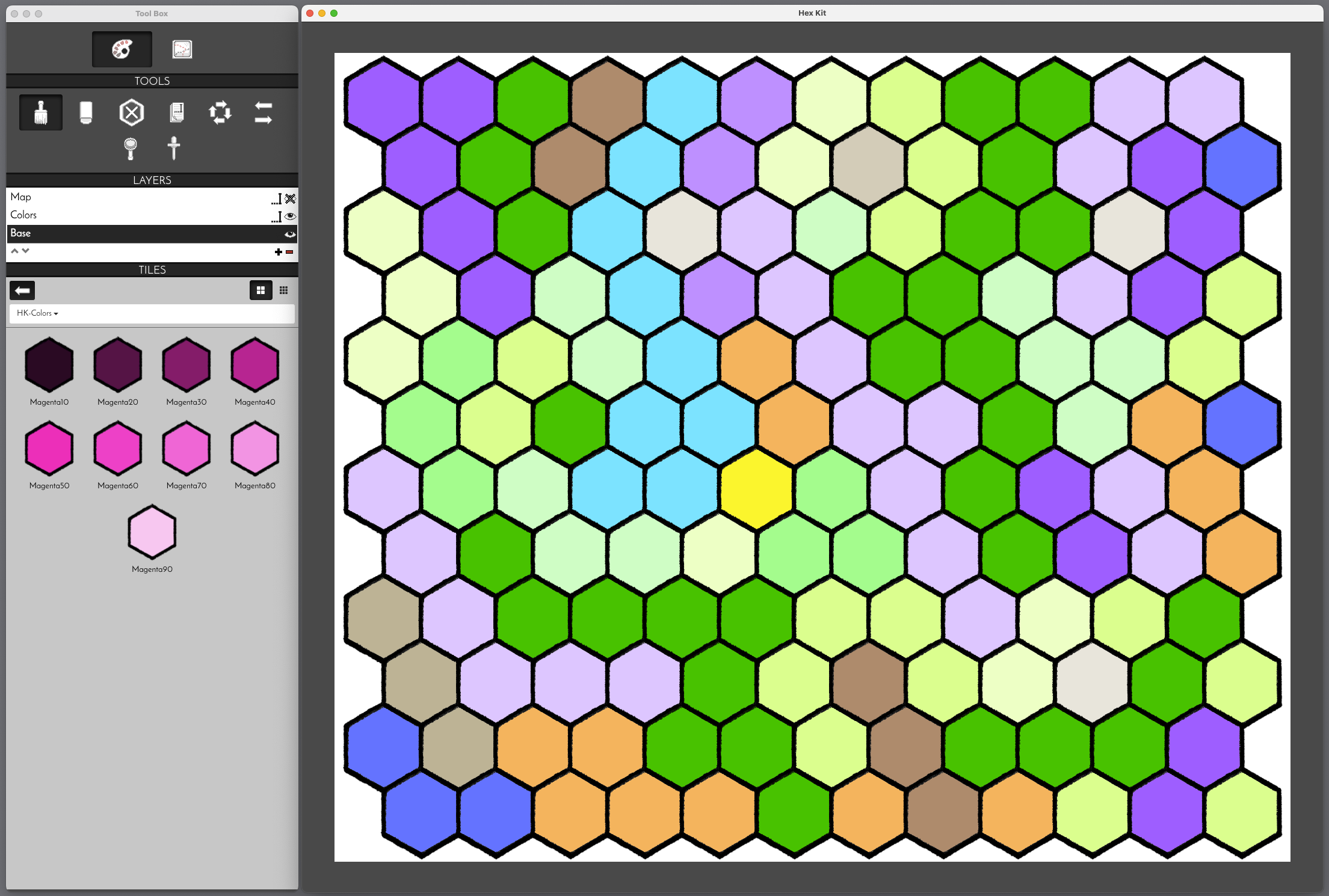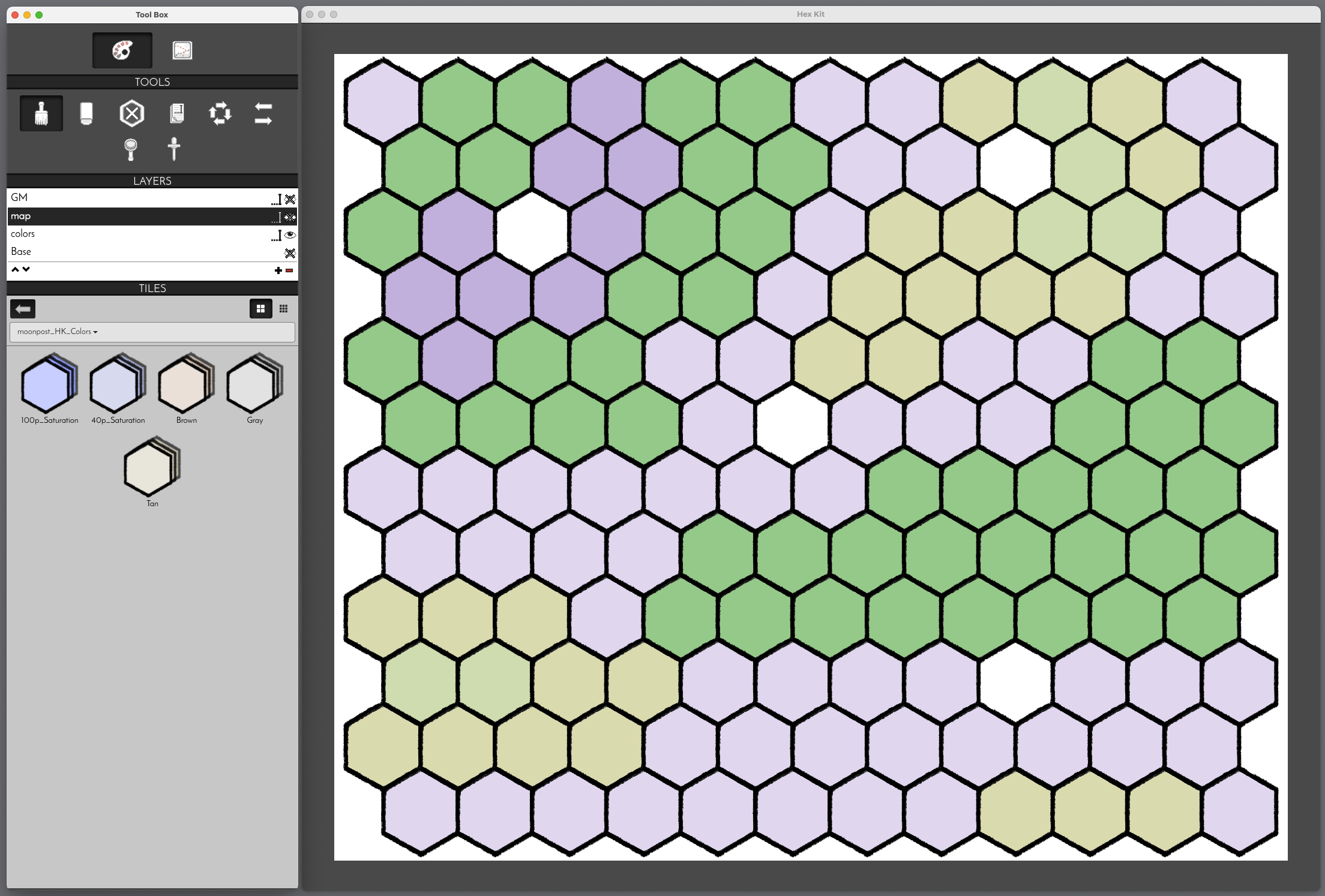 When using these with Hex Kit, just import the tile set and then create a new layer right above the Base layer and paint your hexes with solid colors (I'd always go for the lighter shades). Then, create your map on its own layer on top of that!
